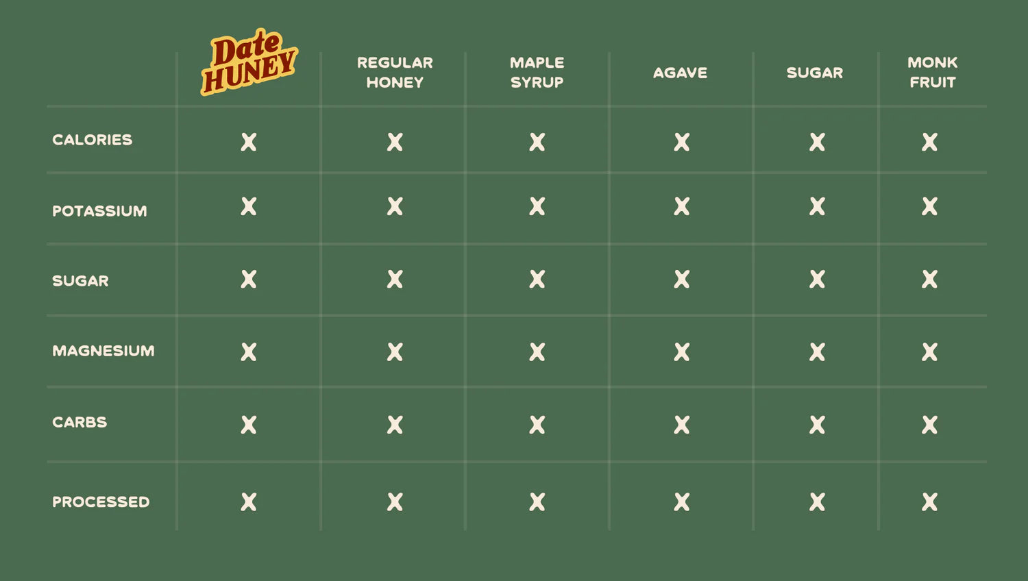 DATE HUNEY IS THE BETTER-FOR-YOU ALL NATURAL SWEETENER IN ITS PUREST FORM. ONCE IT TOUCHES YOUR LIPS YOU’LL NEVER GO BACK. IT’S SWEET, IT’S SAVORY, YOU CAN BAKE WITH IT OR ADD TO YOUR COFFEE. IT’S MADE FROM LIQUIFIED DATES, MAKING IT THE HEALTHIEST SWEETENER OUT THERE. MADE FROM ONE SINGLE INGREDIENT THAT BRINGS CARNIVORES AND VEGANS TOGETHER. AKA, YOUR GRANDMAS FAVORITE SNACK